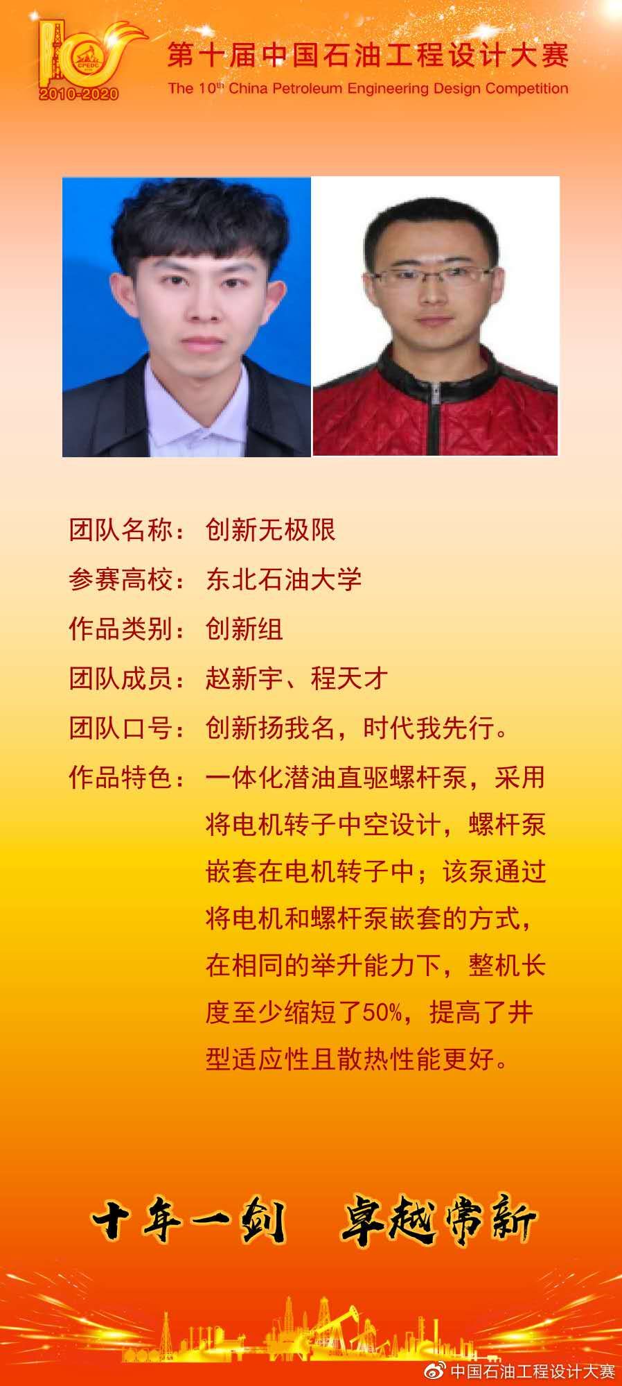 2020年6月13-14日,第十届中国石油工程设计大赛决赛在线上平台顺利举行。共有来自国内27所高校、国外5所高校的5000余名员工和700余名指导教师参与,提交有效作品979份,74支队伍入围全国总决赛。来自中国石油天然气集团公司、中国石油化工集团公司、中国海洋石油集团有限公司和斯伦贝谢公司的61名专家组成专家组,对入围全国总决赛的作品进行评审,评选出一等奖21项,二等奖49项,三等奖4项,公司共获方案设计组二等奖6项。其中由公司赵新宇和程天才等研究生所完成的“机泵同体潜油直驱螺杆泵”、王中杨和胡金兆等研究生完成的“一体智能高效化精细分注装置”项目获得方案设计类二等奖,董康兴、王宝金两位老师获得优秀指导教师奖。