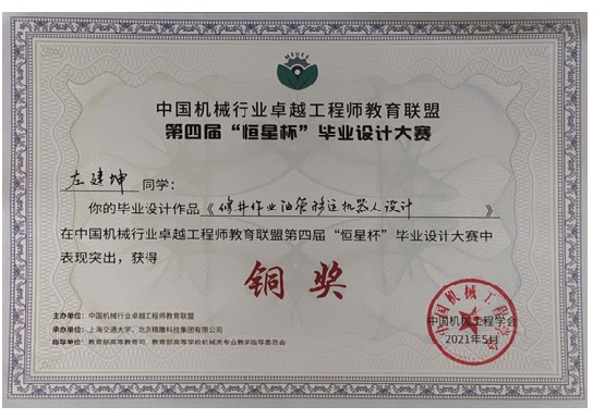 2021年5月25~26日,由教育部高等教育司与教育部高等公司机械类专业教学指导委员会指导,中国机械行业卓越工程师教育联盟主办、上海交通大学和北京精雕科技集团有限公司承办的中国机械行业卓越工程师教育联盟第四届“恒星杯”毕业设计大赛,在上海交通大学成功举办。公司ladbrokes立博的贾光政教授指导、左建坤同学完成的《修井作业油管移运机器人设计》喜获大赛个人项目铜奖。