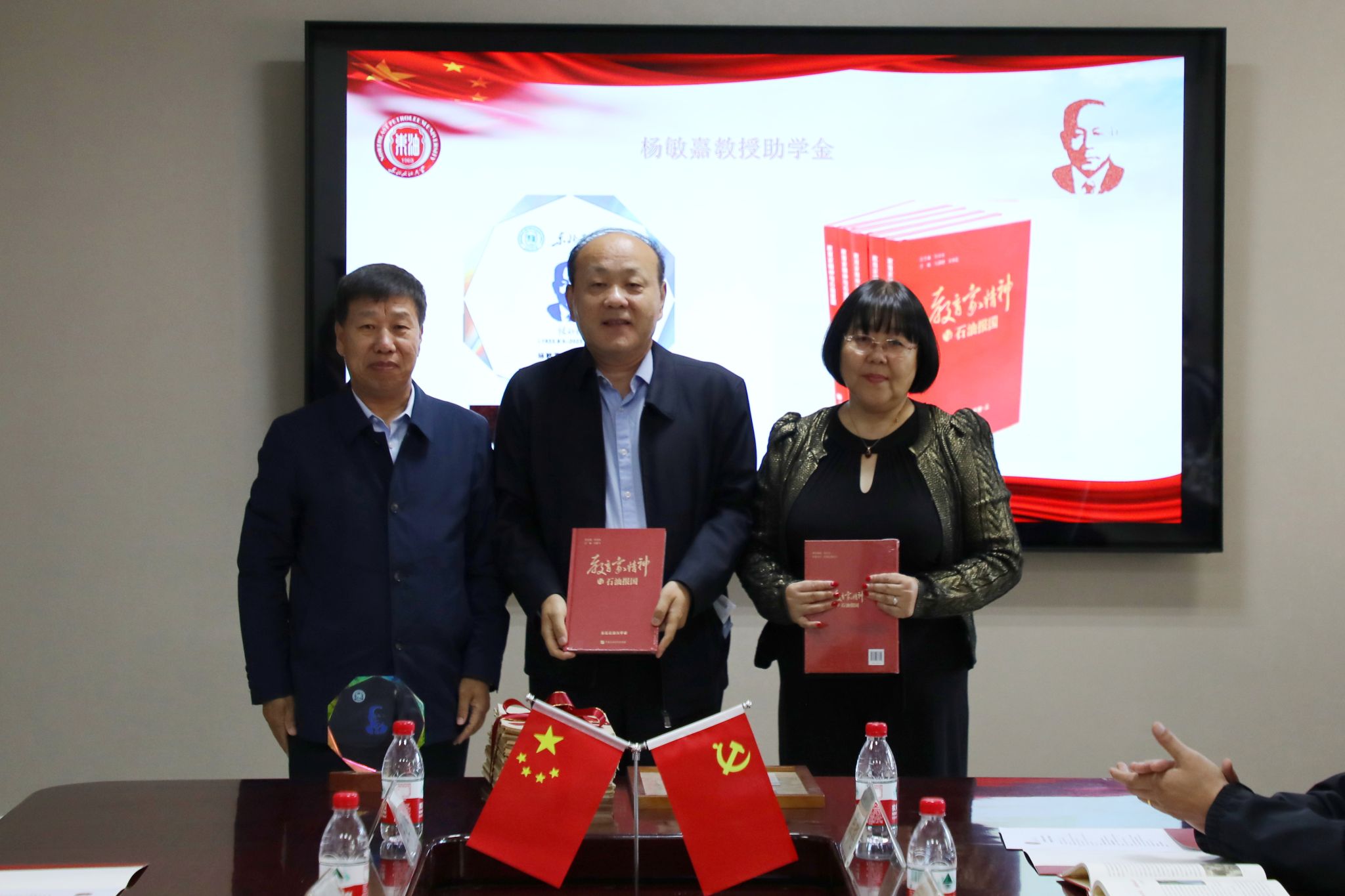 高洪峰代表公司向杨庆、杨松燕赠送《教育家精神与石油报国》丛书。