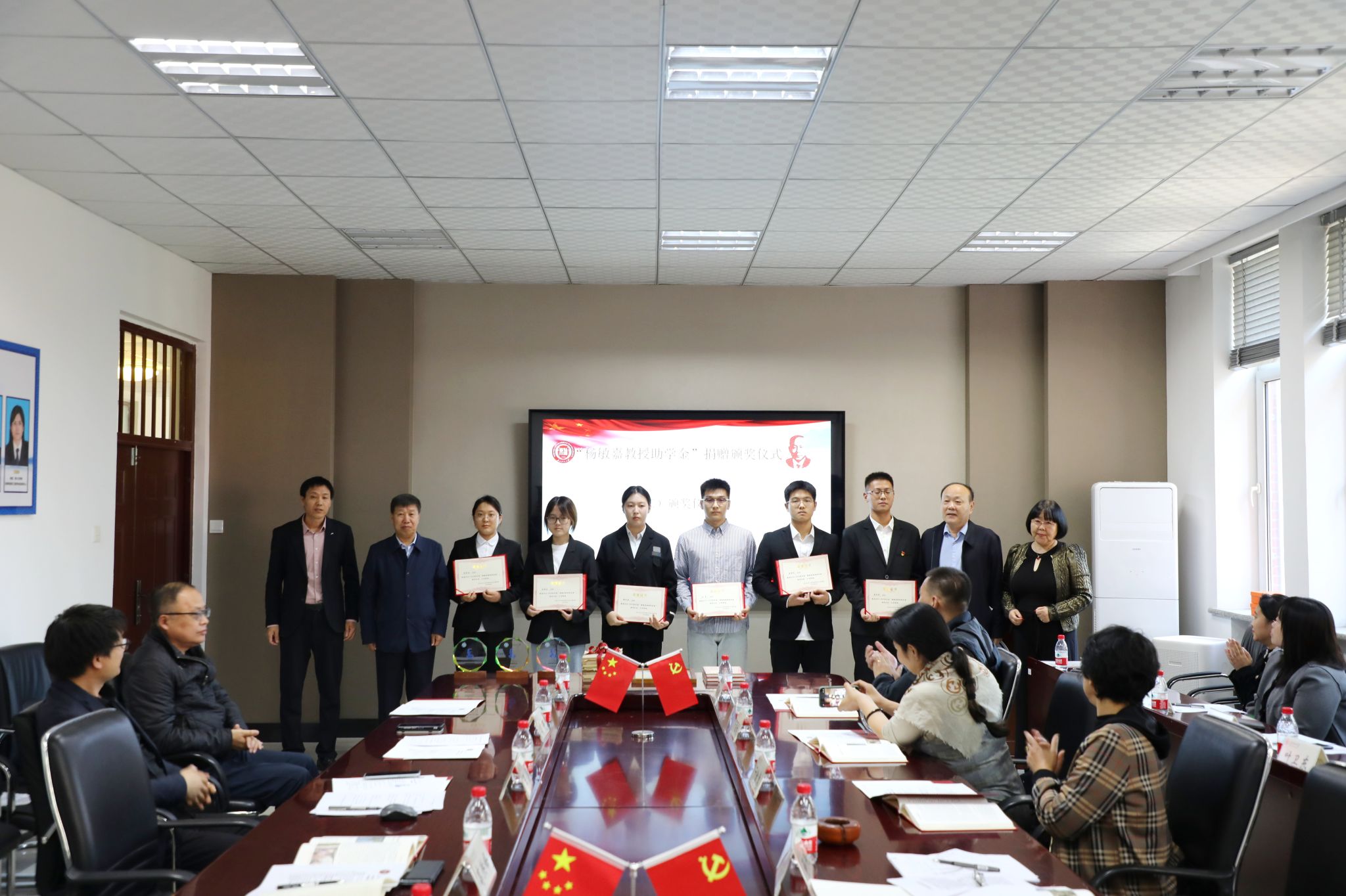 高洪峰、杨庆、杨松燕等为“杨敏嘉教授助学金”获得者颁发证书。
