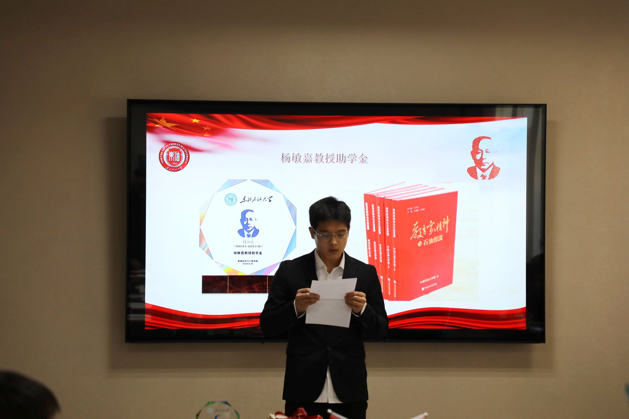 高洪峰代表公司,对杨敏嘉教授的卓越贡献致以崇高敬意和深切缅怀,对杨敏嘉教授家人的慷慨善举表示了诚挚的感谢,向获得资助的同学们表示祝贺,并就汇聚社会各界力量继续做大做强“杨敏嘉教授助学金”提出要求。他指出,杨敏嘉教授是“四有”好老师的模范带头人,是教书育人、培根铸魂的“大先生”,是为党育人、为国育才的教育家,他的事迹是对教育家精神的生动实践。作为东油筹建时期的首批拓荒者,为东油的建设奠基铺路,为机械团队建设发展呕心沥血,他留给我们的精神财富永远值得铭记和传承。“杨敏嘉教授助学金”捐赠颁奖仪式不仅仅是一场仪式,更是深刻的精神洗礼,希望受到资助的同学弘扬杨敏嘉教授精神,勇担历史重任,树牢能源报国之志,展现青年一代的担当与作为,为强国建设、民族复兴伟业贡献青春力量。
