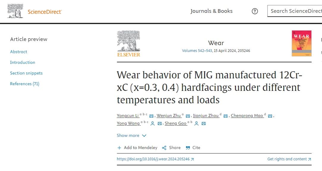 公司2021级硕士研究生朱文俊在《Wear》(IF=5.0,中科院一区top期刊)上发表题为“Wear behavior of MIG manufactured 12Cr-xC (x=0.3, 0.4) hardfacings under different temperatures and loads ”的研究论文。(DOI:https://doi.org/10.1016/j.wear.2024.205246)。