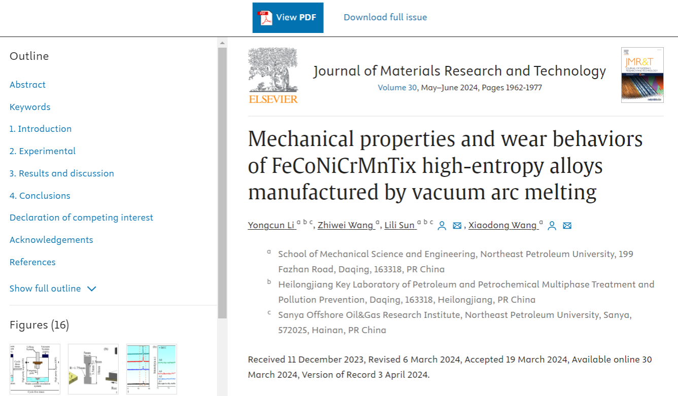 公司2022级硕士研究生王志伟在《Journal of Materials Research and Technology》(IF=6.40,SCI TOP期刊)上发表题为“Mechanical properties and wear behaviors of FeCoNiCrMnTix high-entropy alloys manufactured by vacuum arc melting”的研究论文(DOI:https://doi.org/10.1016/j.jmrt.2024.03.137)。