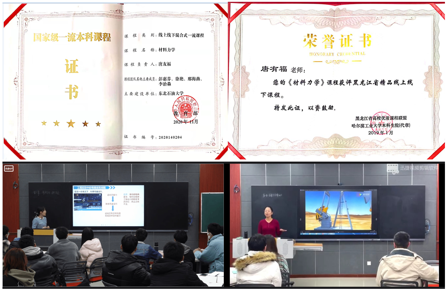 《材料力学》课程获批国家级一流本科课程、省级线上线下混合式一流课程。正式出版《有限单元法及应用》、《石油钻采管柱力学》、《塑性力学与ANSYS应用》等多本教材,其中《有限单元法》获得校级优秀教材。近年来教师在省级教学能力大赛上多次获奖,其中获得黑龙江省力学微课教学比赛一等奖2项,黑龙江省高校教师教学创新大赛一等奖1项、三等奖1项,全国基础力学青年教师讲课比赛优胜奖1项。